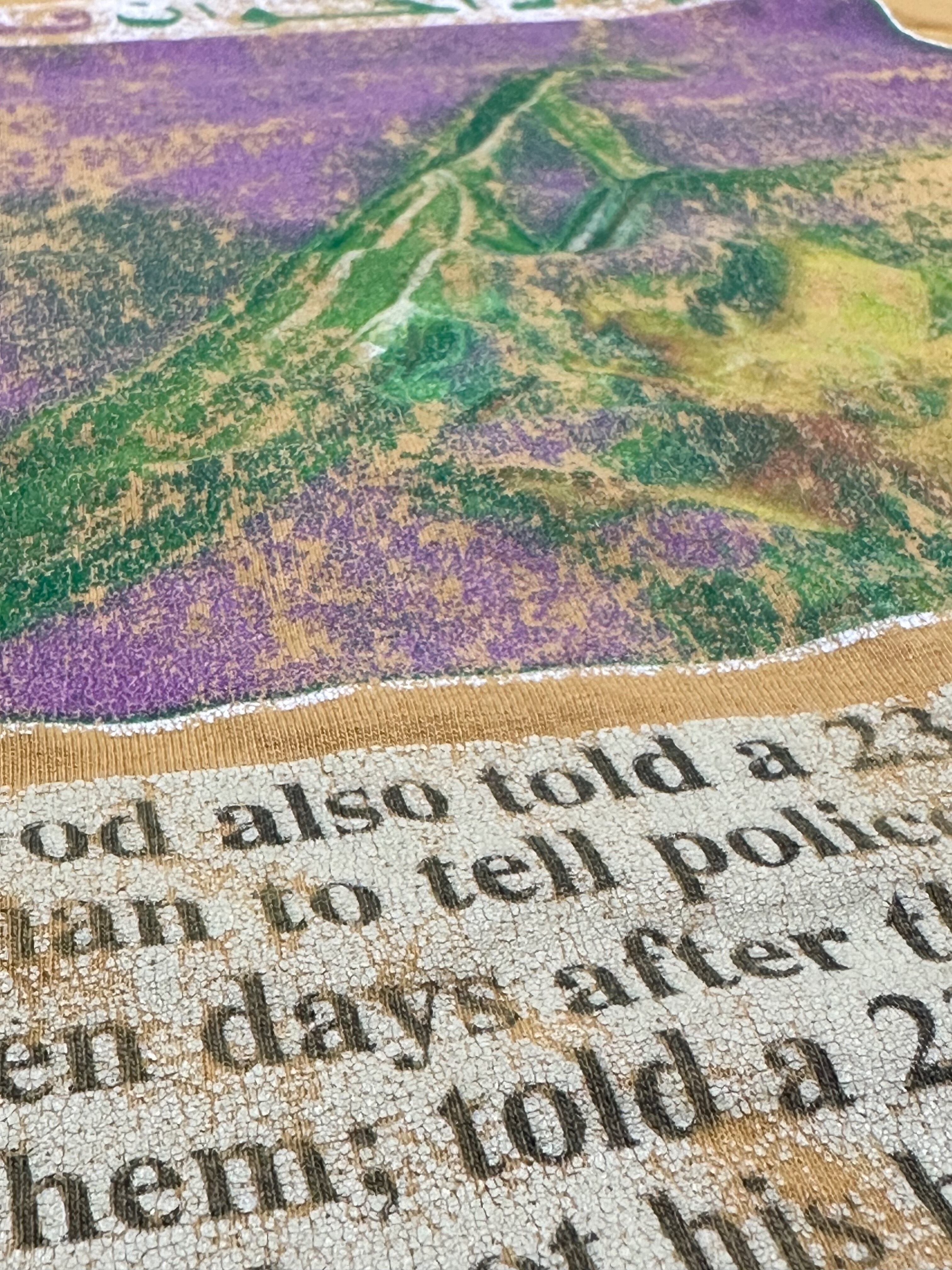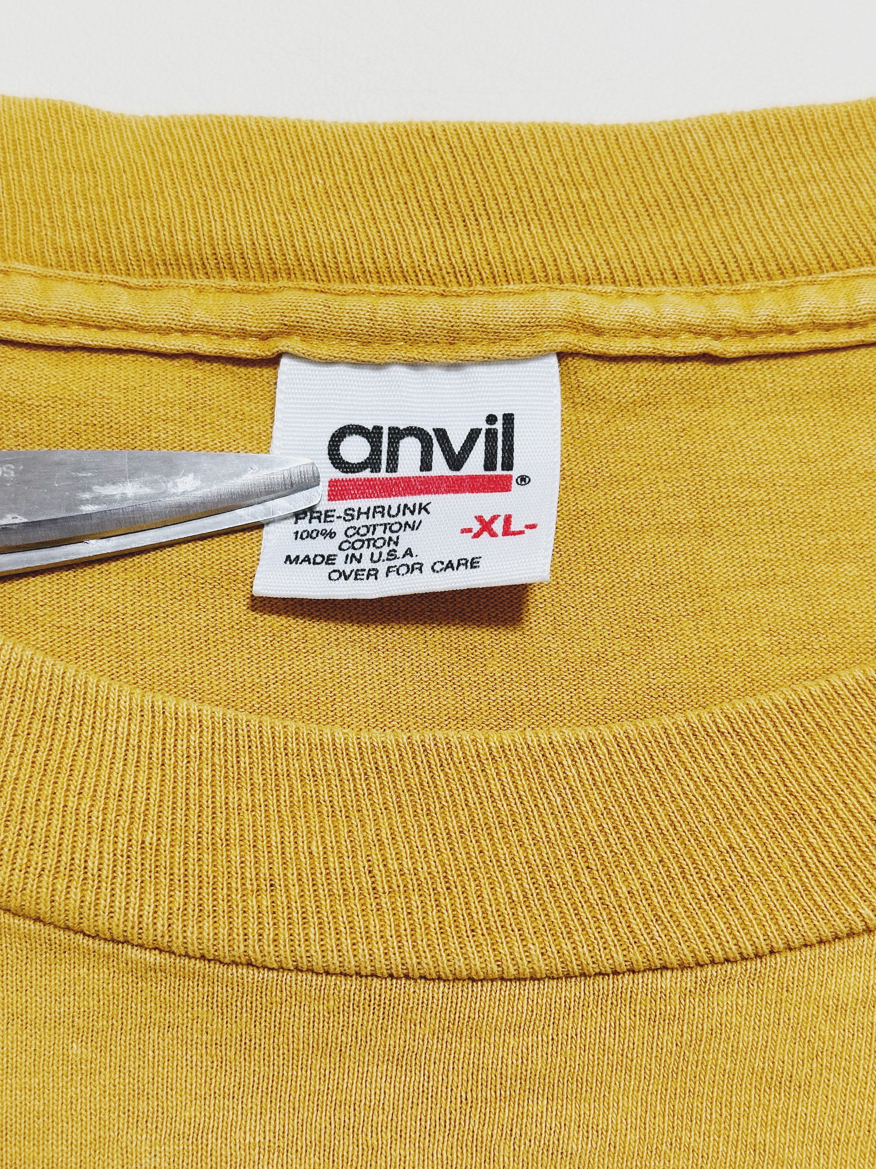 バックの“神が語った殺人の証言”は、当時アメリカで物議を醸した事件記事をそのまま引用しており、皮肉とユーモアを織り交ぜたバンドらしい表現。荒々しいひび割れ、フェード感、そしてanvilボディという三拍子が揃ったグッド・ヴィンテージ。これはもはや着るというより「着られてやる」一着です。